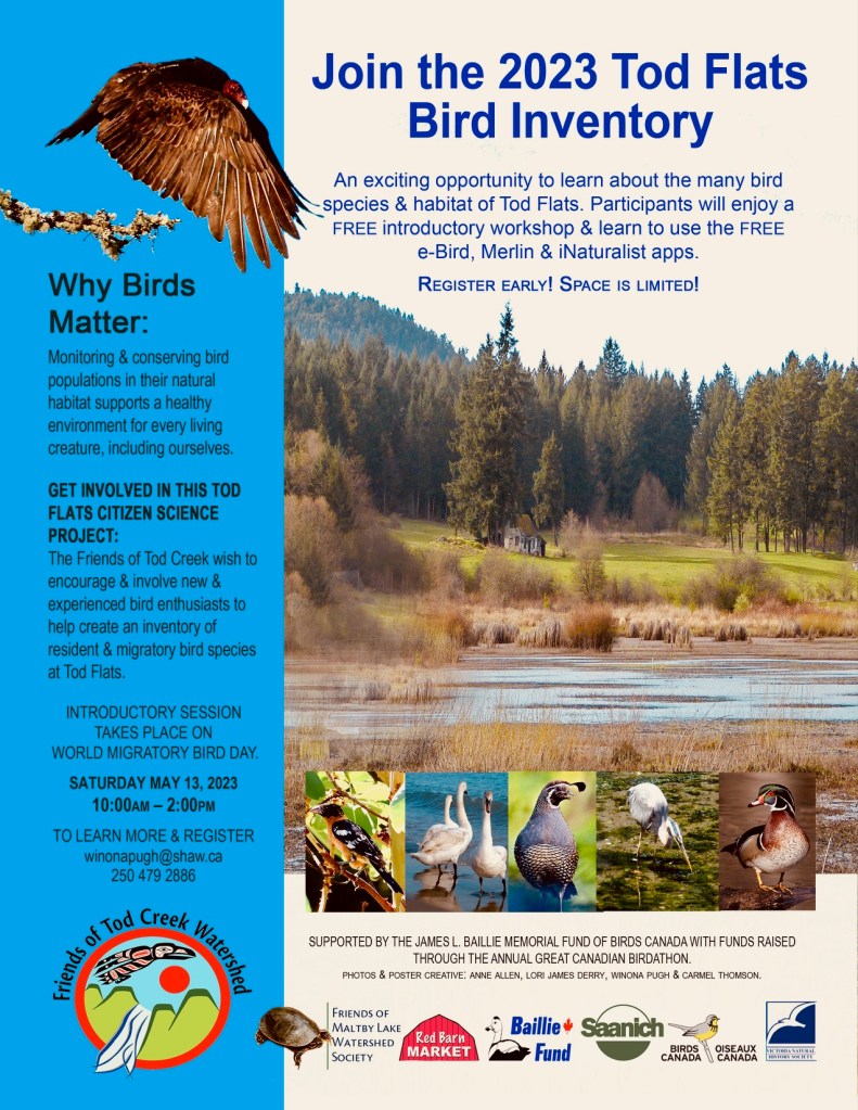 The Friends of Maltby Lake Watershed Society is a proud contributor & sponsor in this important bird inventory. Birds Canada and the Baillie Fund support research, monitoring, education, and conservation projects that involve wild bird species occurring in Canada. Training and presentation delivered by Staff with the District of Saanich. The Tod Flats Bird Inventory runs from May to December and is spearheaded by our colleagues at the Friends of Tod Creek Watershed.